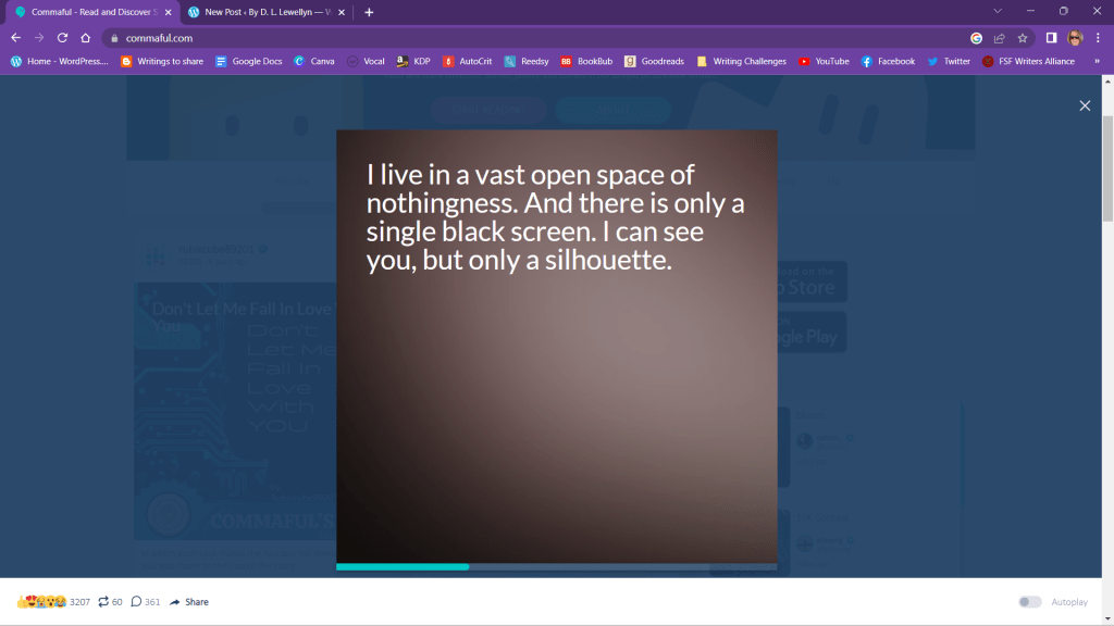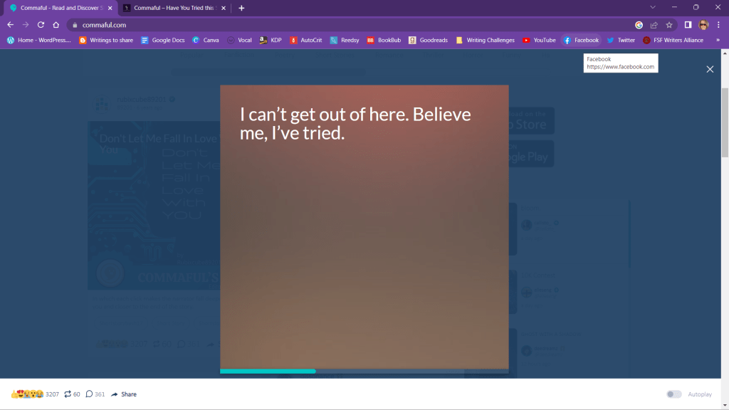 Commaful allows authors to tell their stories with pictures. You get a square space for an image and room to put a sentence per page. The story basically advances line by line. You can use this for Fanfiction, Poetry, Flash Fiction and Short Stories. It can be a suspense story, romance, or comedy. The sky is the limit! I’m intrigued. Let me know what you think.