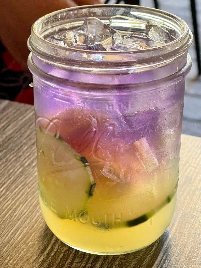 Empress Linen with Indigo Gin, Elderflower liqueuer, lemonade, and cucumber