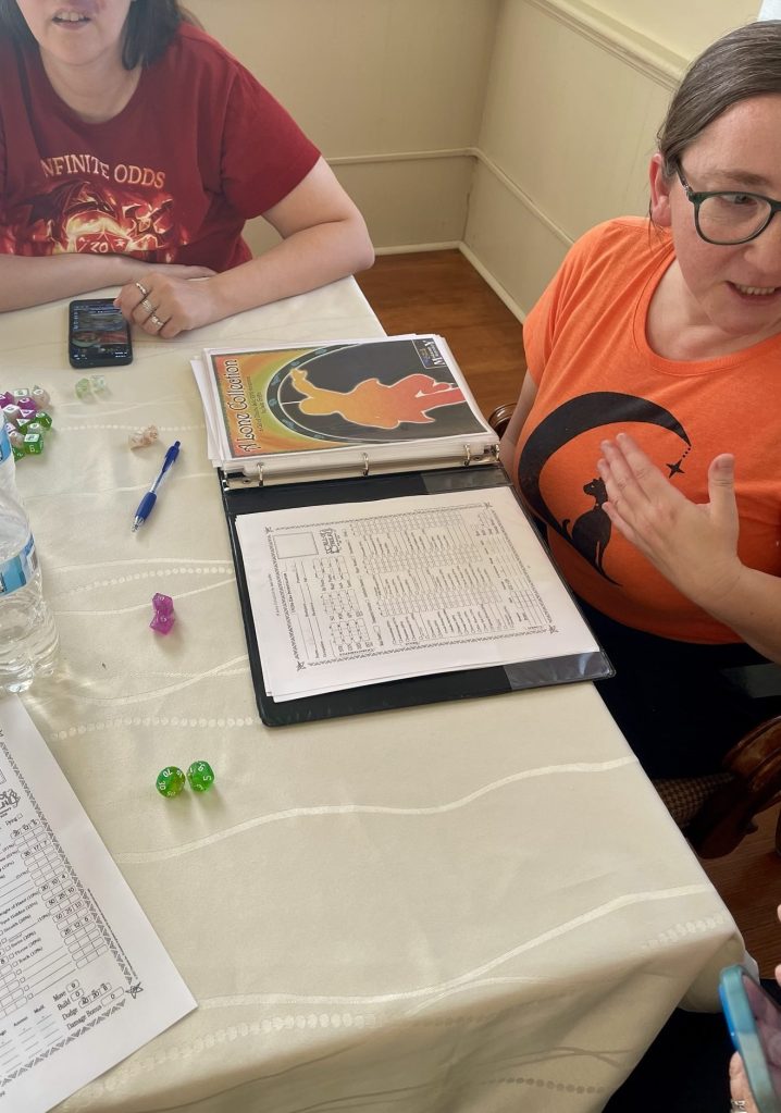 An unexpected highlight was the opportunity to play my first TTRPG! Author Jade Griffin writes companion novels to the Call of Cthulhu RPG series Amor Fati, which act as both a player handout and minor mythos tome. Dee and I got a beginner’s crash course as Mr. Wabash in 1896 Chicago. I’ve always wanted to play a tabletop role playing game, and it was way more fun than I even imagined, thanks in no small part to Jade’s excellent story. Jade will visit my Spotlight in September.